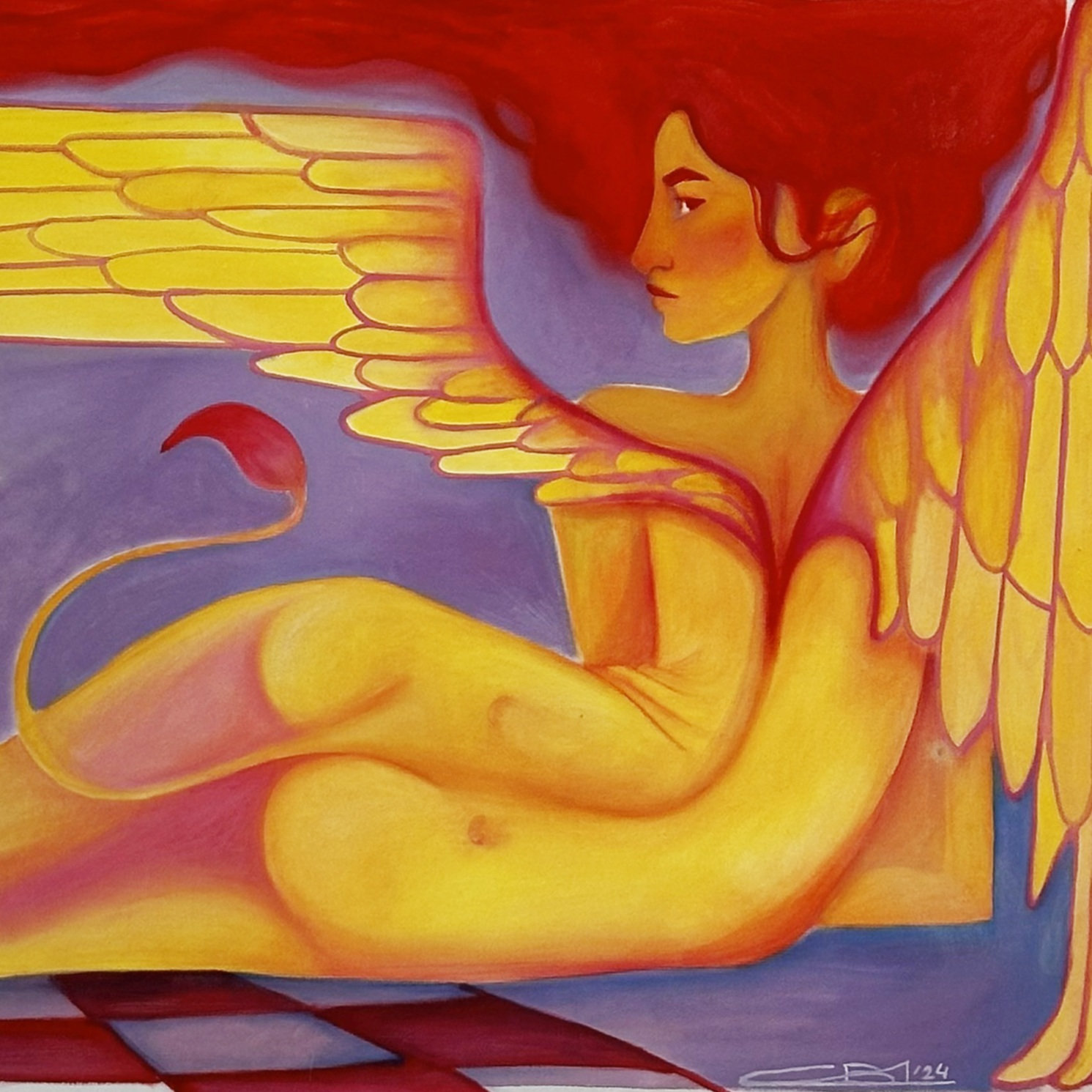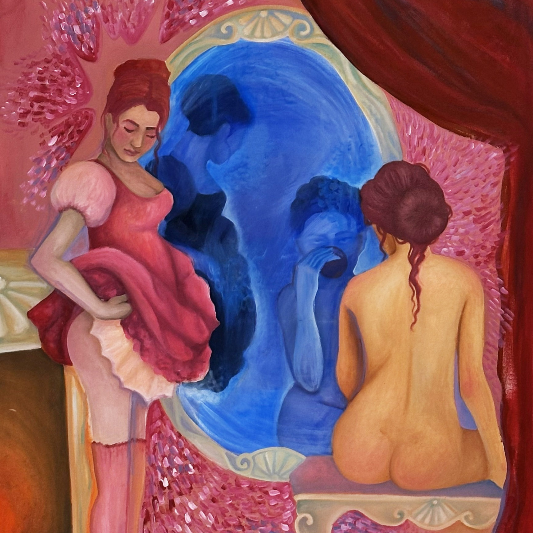 Formada en una familia de artistas y actualmente estudiante de Historia del Arte en la UBA, alterna el trabajo en su casa-taller con el atelier de Julio Alan Lepez. En piezas como Era el Hombre, reinterpreta mitos y referencias clásicas con un giro contemporáneo que vuelve su pintura íntima, vibrante y profundamente personal.